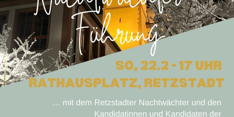 Gemeinderatswahl 2026 in Retzstadt – CSU, CFW und UWG Liebe Bürgerinnen und Bürger von Retzstadt, wir laden Euch herzlich zur Nachtwächterführung am Sonntag, den 22. Februar, um 17:00 Uhr, mit…