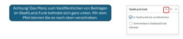 Das wichtigste zuerst: Das Kästchen „Im StadtLand.Funk veröffentlichen“ muss für eine Veröffentlichung in der App wie bisher durch Häkchen aktiviert sein.