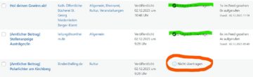 Unter „Beiträge“ könnt ihr künftig auch den Status eures Posts sehen: Sollte hier Hinweis „nicht übertragen“ erscheinen, bitte nochmal prüfen, ob ihr das oben beschriebene Häkchen „im StadtLand.Funk veröffentlichen“ aktiviert habt. Ansonsten bitte Häkchen einfach neu setzen und Beitrag aktualisieren (ggfs. mit angepasster Zeit er Veröffentlichung)!