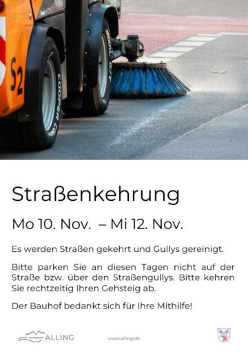 Von Montag 10. bis Mittwoch 12. November werden im gesamten Gemeindegebiet die Straßen gekehrt und Gullys gereinigt. Bitte verzichten Sie an diesen Tagen auf das Parken an der Straße und über den Gullys.