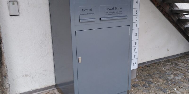 Die Stadtbücherei erfüllt den lang gehegten Wunsch vieler Nutzerinnen und Nutzer nach einem Rückgabekasten direkt vor Ort. Dank des neuen Rund-um-die-Uhr-Services können Bücher und elektronische Medien ab sofort auch außerhalb der Öffnungszeiten abgegeben werden. Der graue Schrank steht an der Eingangstür zum Kornkasten neben der Ausleihbox. Er hat ein Fach für die Rückgabe elektronischer Medien und eines für Bücher. Letztere müssen mit dem Buchrücken zuerst eingeworfen werden, um Beschädigungen zu vermeiden. Die Rückgabe erfolgt auf eigenes Risiko und ist nur für Medien der Stadtbücherei möglich. Ist die Rücknahmekapazität erschöpft, verriegeln die Schubladen automatisch. Die Stadtbücherei bietet nun insgesamt zwei Rückgabeboxen an. Bereits seit 2017 steht eine 24-Stunden-Rückgabe am Bahnhof.