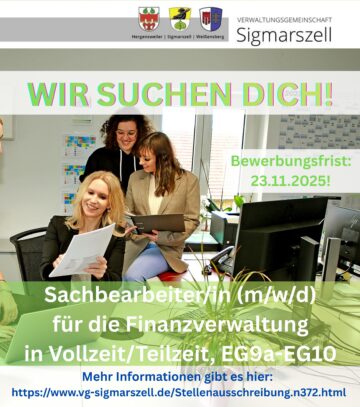 Amtliche Meldung Allgemein Sigmarszell, Verwaltungsgemeinschaft Sachbearbeiter/in für die Finanzverwaltung Verwaltungsgemeinschaft Sigmarszell Posted on 07. Nov 2025 Anzeige Umsatzsteuersachbearbeitung – 1 Der Beitrag steht unter Einhaltung der Bildrechte von Dritten zur freien Verfügung.