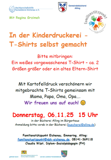 Bastelnachmittag in der Gemeindebücherei: „In der Kinderdruckerei – T-Shirts selbst gemacht“ am 06. November 2025 um 15.00 Uhr (siehe Flyer)