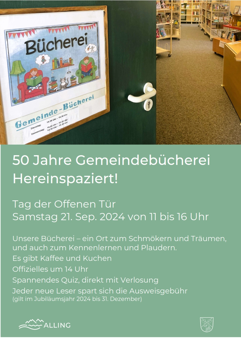 [Amtlicher Beitrag] Bücherei Tag der Offenen Tür 21.09.24 Variante Türschild (Grün für Social Media)_001 9. September 2024 842 × 1191
