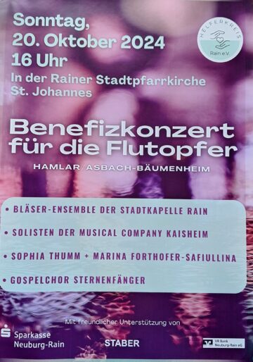 Bereits stattgefunden Veranstaltung [Amtlicher Beitrag] Benefizkonzert am 20. Oktober [Amtlicher Beitrag] Helferkreis Rain e.V. Posted on 08. Okt 2024 Add to calendar zu Google Kalender hinzufügen iCalendar Outlook 365 Outlook Live Details Datum: 20. Oktober 2024 Zeit: 16:00 - 19:00 Veranstaltungsort [Amtlicher Beitrag] Stadtpfarrkirche Rain/Lech Veranstalter [Amtlicher Beitrag] Helferkreis Rain e.V.