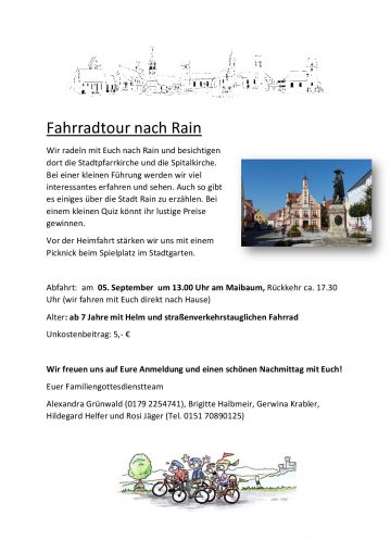 Bereits stattgefunden Veranstaltung [Amtlicher Beitrag] FAHRRADTOUR NACH RAIN mit dem Familiengottesdienstteam [Amtlicher Beitrag] Famieliengottesdienstteam Posted on 05. Aug 2022 Add to calendar zu Google Kalender hinzufügen iCalendar Outlook 365 Outlook Live Details Datum: 5. September 2022 Zeit: 13:00 - 17:30 Veranstaltungsort [Amtlicher Beitrag] Rain Veranstalter [Amtlicher Beitrag] Famieliengottesdienstteam