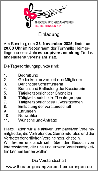 23. Nov Veranstaltung Heimertingen Jahreshauptversammlung Theater- und Gesangverein Heimertingen Theater- und Gesangverein Heimertingen e.V. Posted on 20. Nov 2025 Herzliche Einladung an alle Mitglieder und Interessierte: Add to calendar zu Google Kalender hinzufügen iCalendar Outlook 365 Outlook Live Details Datum: 23. November Zeit: 20:00 - 21:30 Veranstaltung-Tags:Jahreshauptversammlung Veranstaltungsort Turnhalle Heimertingen Sechsbaumweg 3 Heimertingen, 87751 Germany + Google Karte Veranstalter Theater- und Gesangverein Heimertingen e.V. E-Mail webmaster@theater-gesangverein-heimertingen.de View Veranstalter Website