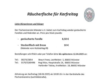 Bereits stattgefunden Veranstaltung [Amtlicher Beitrag] Räucherfische an Karfreitag [Amtlicher Beitrag] Fischereiverein Münster Posted on 07. Apr 2025 Add to calendar zu Google Kalender hinzufügen iCalendar Outlook 365 Outlook Live Details Datum: 18. April Zeit: 10:00 - 12:00 Veranstaltungsort [Amtlicher Beitrag] Gerätehalle des Fischereivereins (Lechfeldstraße) Veranstalter [Amtlicher Beitrag] Fischereiverein Münster