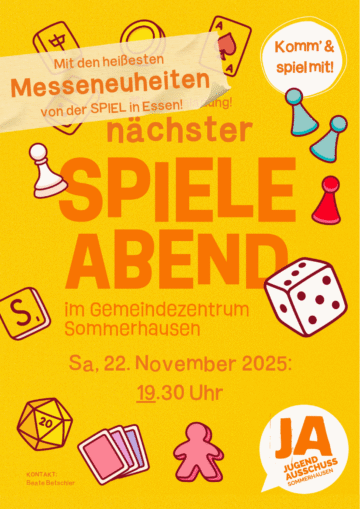 Am Samstag, den 22. November 2025, ab 19:30 Uhr, lädt der Jugendausschuss Sommerhausen wieder alle Spielbegeisterten zum Spieleabend ins Gemeindezentrum Sommerhausen ein.