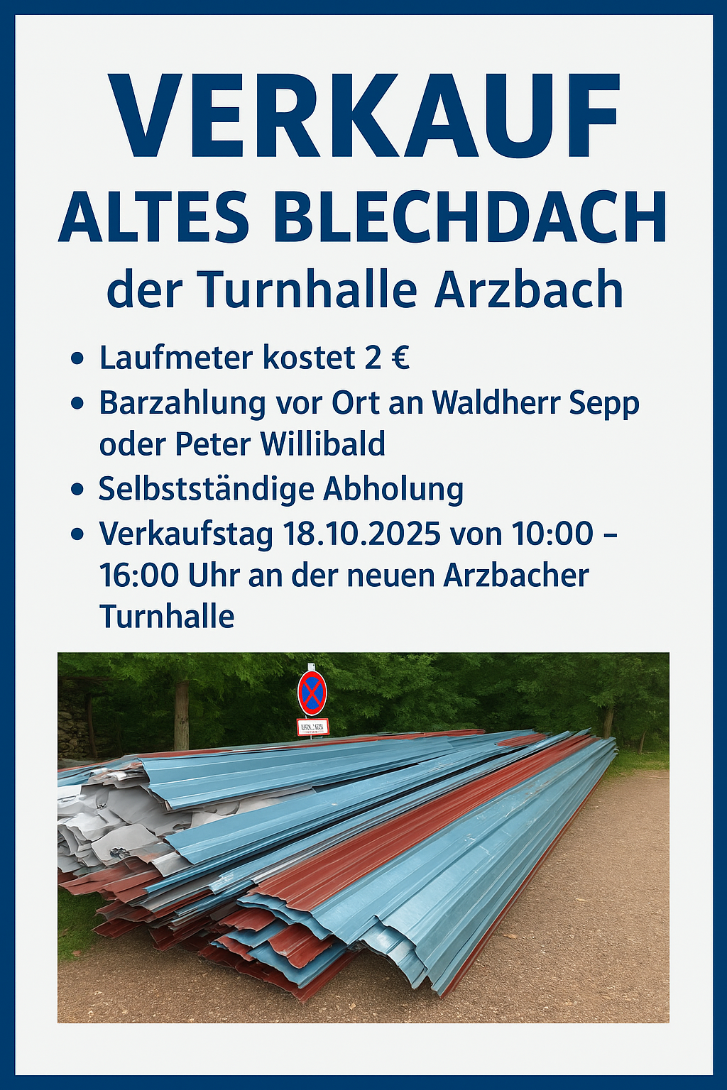Der SV Wackersberg-Arzbach verkauft am 18.10.2025 das alte Blechdach der Turnhalle in Arzbach. Es handelt sich um das Blech mit Hagelschaden aus dem Jahr 2023. Alle weiteren Angaben sind auf…