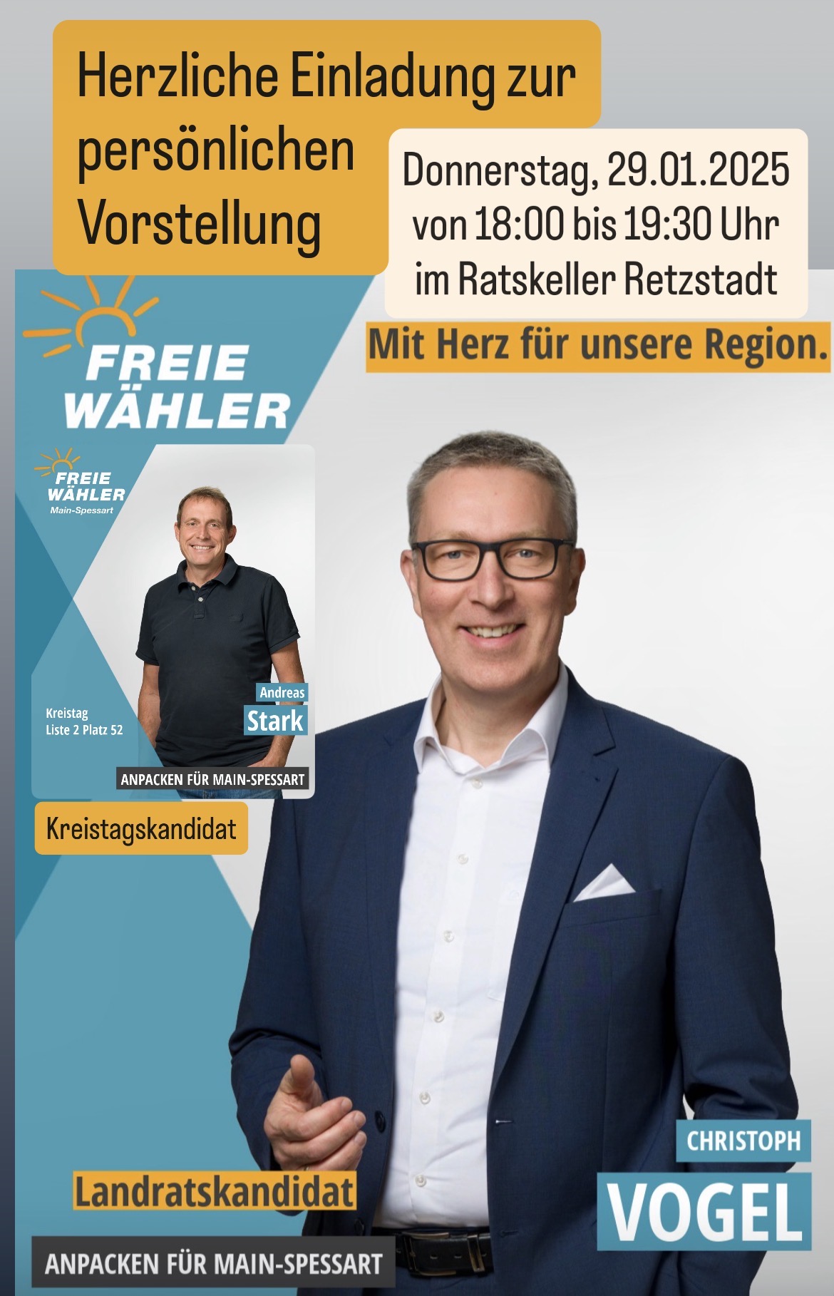 Christoph Vogel, Freie Wähler-Landratskandidat für Main-Spessart, kommt in den Ratskeller zur öffentlichen Vorstellung. Mit dabei ist u.a. Andreas Stark - unser Retzstadter Kandidat für den Kreistag. Alle interessierten Bürgerinnen und… |