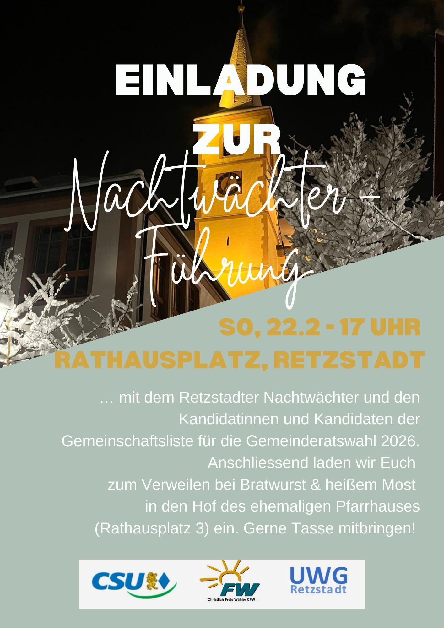 Gemeinderatswahl 2026 in Retzstadt – CSU, CFW und UWG Liebe Bürgerinnen und Bürger von Retzstadt, wir laden Euch herzlich zur Nachtwächterführung am Sonntag, den 22. Februar, um 17:00 Uhr, mit…