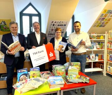 Bild: Spendenübergabe (v.l.n.r.) Bürgermeister Stefan Joachimsthaler, Sparkassen-Vorstand Frank Opitz, Büchereileitung Andrea Schlick, Amtsleiter Benedikt Friedinger