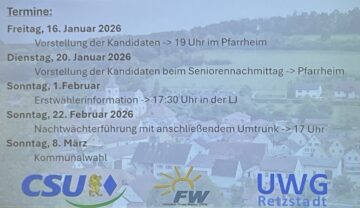 Retzstadt, 30. Oktober 2025 – Ein starkes Zeichen für Geschlossenheit und Zusammenarbeit setzten die Retzstadter Ortsverbände der CSU, der Christlich Freien Wähler (CFW) und der Unabhängigen Wählergemeinschaft (UWG) bei ihrer Nominierungsversammlung am 30. Oktober um 19 Uhr im Pfarrheim Retzstadt.