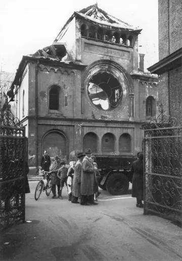 Bilder: Ausgebrannte Synagoge an der Herzog-Rudolf-Str. sowie geplündertes Kaufhaus Uhlfelder in der Rosenstr. 12-16 (Bildnachweis: Stadtarchiv München / BR).