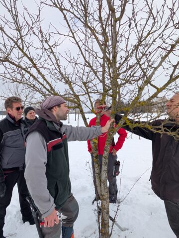 Wetterfest und mit großem Interesse zeigten sich die Teilnehmer am vergangenen Freitag am Obstbaum-Schneidekurs . Warm gekleidet und bestens ausgerüstet kamen sie auf die schneebedeckte Streuobstwiese am Nussfeld.